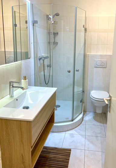 Die offene Küche ist komplett ausgestattet, perfekt für ein entspanntes Frühstück oder kleine Kochabende. Das moderne Bad mit Dusche und WC rundet unsere schöne Ferienwohnung ab. Durch die Süd-West-Ausrichtung ist die Wohnung den ganzen Tag herrlich hell, und auf dem Balkon genießt ihr die Sonne vom späten Vormittag bis zum Sonnenuntergang.